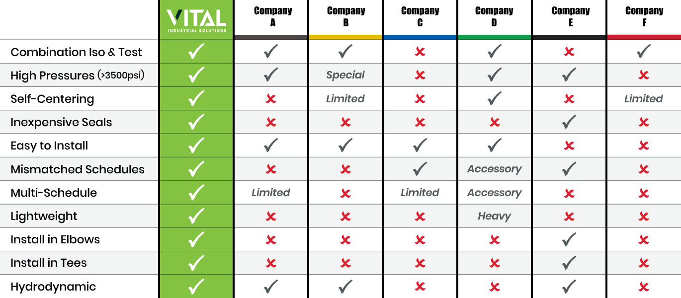 Compared to its competitors, Vital tools allow you to use fewer tools as all tools are Combination Isolation and Test Tools that accommodate multi-schedules via swapping out seals. The slim and lightweight design means no crane is required typically.